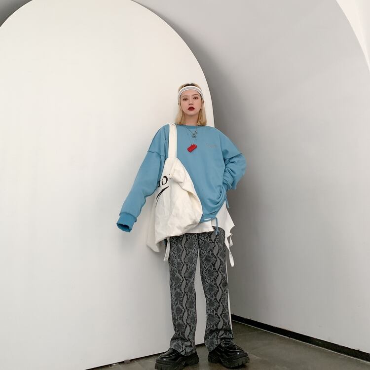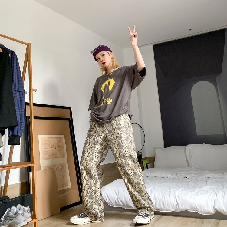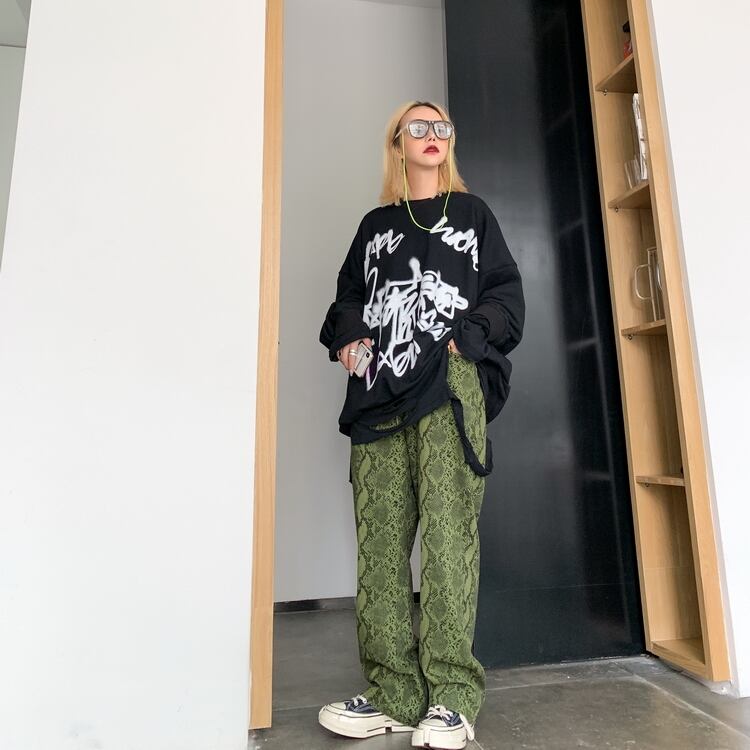 ボトムス パンツ ズボン ワイドパンツ ストレートパンツ ロング ロング丈 ストレート Iライン ウエストゴム きれいめ シンプル カジュアル おしゃれ お洒落 かっこいい こなれ感 ラフ ボーイッシュ ルーズ 個性的 存在感 とろみ感 柄 アニマル柄 スネーク柄 蛇柄 プリント オールシーズン シーズンレス 10代 20代 30代 レディース お出かけ 楽ちん S M L グリーン グレー ベージュ