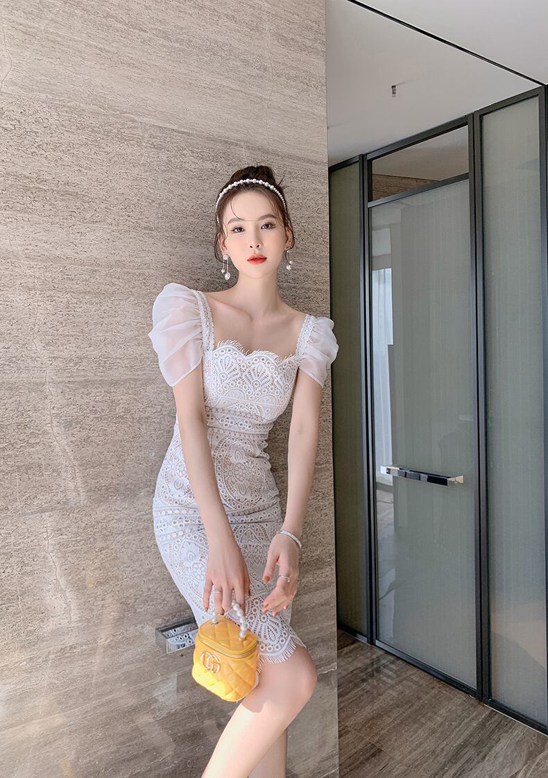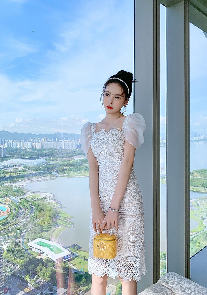 ドレス ワンピース パーティードレス 膝丈ドレス 膝丈 ひざ丈 膝下 ボリューム袖 パフスリーブ スクエアネック 襟なし スレンダー スレンダーライン タイト スリム 細身 レース チュール シフォン ウエストマーク クロシェ 編み込み 透け感 ポリエステル 大人可愛い 上品 おしゃれ お洒落 大人女子 こなれ感 ガーリー セクシー エレガント モダン 主役級 とろみ感 抜け感 華やか クラシック 清楚 柄 30代 40代 レディース デート お出かけ モテ 夏 お呼ばれ S M L XL ホワイト