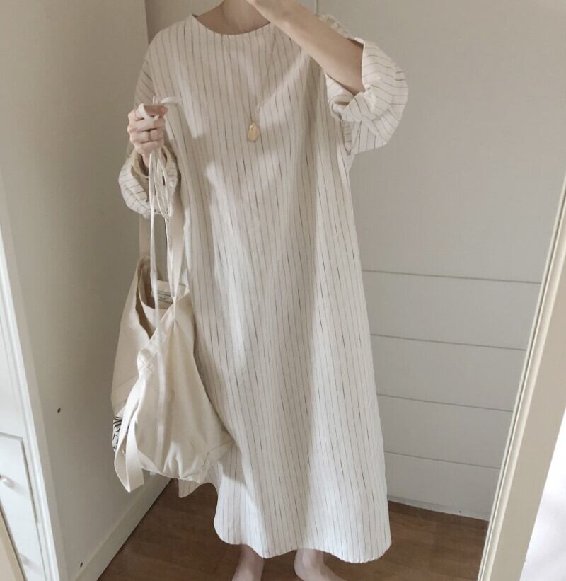 ワンピース プルオーバー ロング ロング丈 袖あり 長袖 ボリューム袖 ラウンドネック ストレート ワイド Iライン リボン ベルト ウエストマーク 綿 麻 きれいめ シンプル カジュアル 大人 上品 おしゃれ お洒落 レトロ 大人女子 こなれ感 ラフ ルーズ 抜け感 柄 ストライプ シマ 春 夏 秋 30代 40代 50代 60代 レディース お出かけ 休日 リゾート 海 楽ちん 体系カバー S M L XL ホワイト