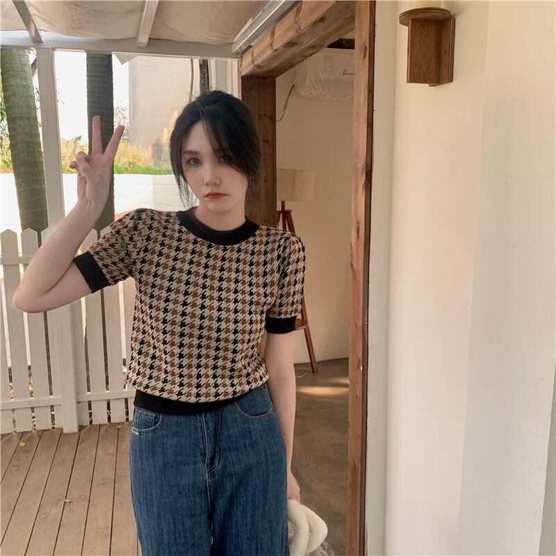 トップス ニットソー ショート ショート丈 袖あり 半袖 パフスリーブ Uネック 襟なし スリム Iライン ニット 大人可愛い シンプル カジュアル 大人 おしゃれ お洒落 レトロ 大人女子 こなれ感 マニッシュ ガーリー 柄 千鳥格子 秋 20代 30代 40代 デート お出かけ 休日 普段使い フリーサイズ ブラウン ピンク