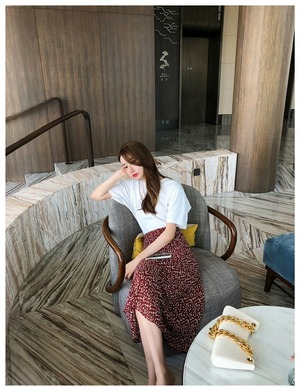 赤い花柄のスリムなミディアムスカートです。
