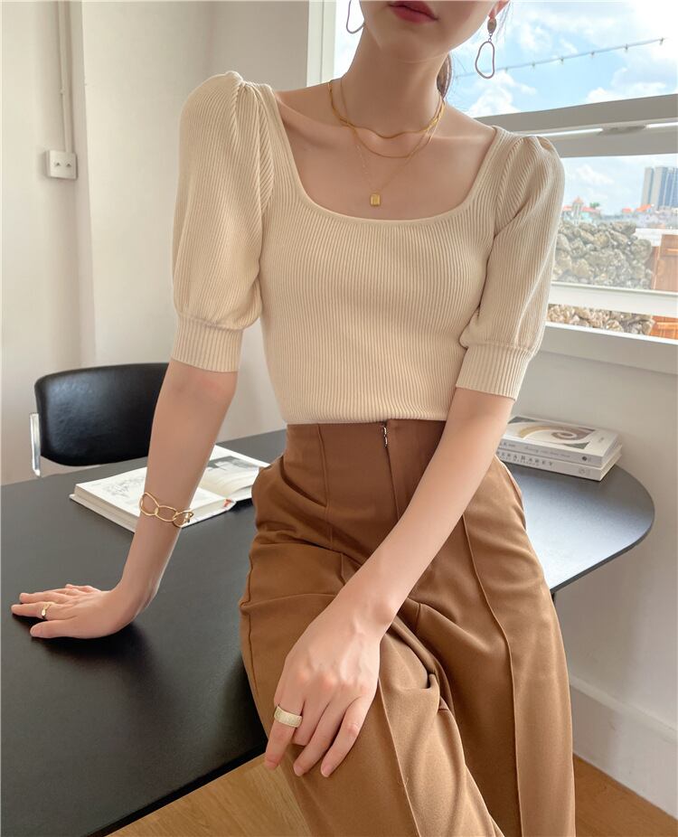 トップス ニットソー ショート ショート丈 袖あり 半袖 パフスリーブ スクエアネック スリム タイト 細身 伸縮性 ニット かわいい 大人可愛い きれいめ シンプル カジュアル 大人 上品 おしゃれ お洒落 かっこいい レトロ 大人女子 こなれ感 ガーリー エレガント 抜け感 無地 春 秋 20代 30代 レディース デート お出かけ ファッション コーデ スタイル モテ S M ブラック ブルー オフホワイト