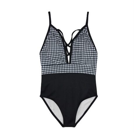 水着 スイムウェア ワンピース 三角 Vネック クロス ステッチ ウエストマーク スリット 切り替えデザイン バックシャン ハイウエスト 胸元 谷間 大人可愛い セクシー シンプル カジュアル ナチュラル 大人 大人っぽい おしゃれ お洒落 レトロ 存在感 女っぽ スタイリッシュ モダン かっこいい マニッシュ 柄 格子柄 夏 海 ビーチ プール リゾート 旅行 スタイルアップ 美スタイル モテ M L XL 黒 ブラック