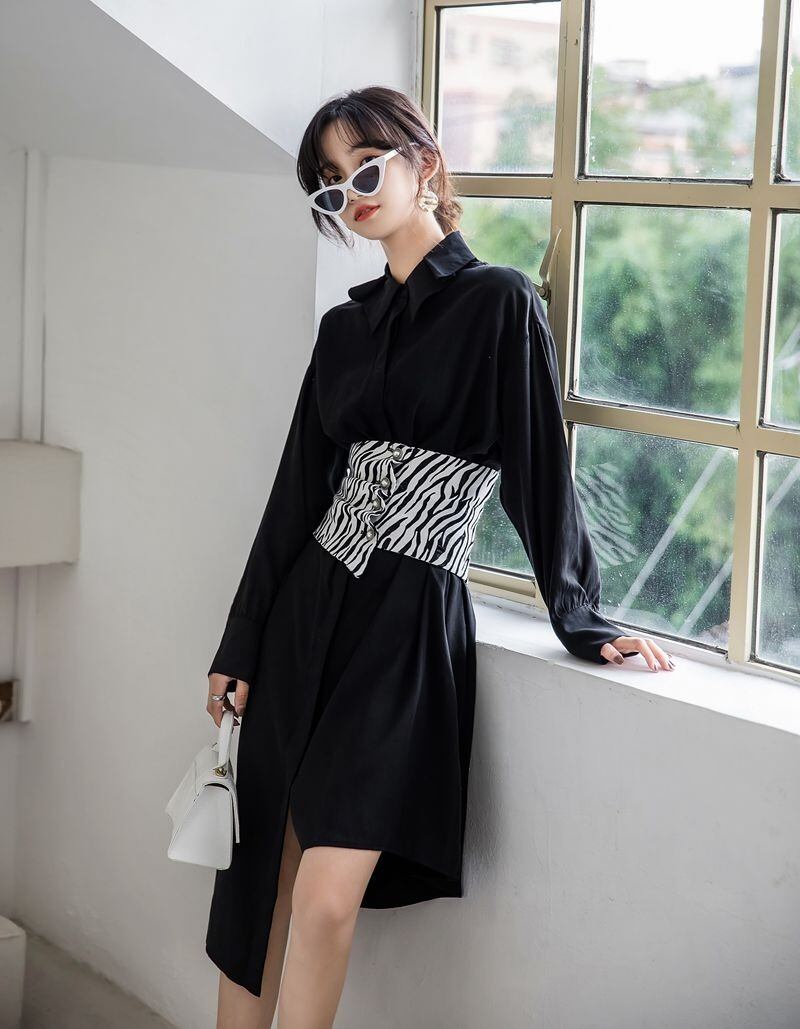 ワンピース シャツワンピース シャツワンピ ミドル丈 ミドル丈ワンピース 長袖ワンピース 長袖 ロングスリーブ アシンメトリー アシメ シンプル 無地 ゼブラ ゼブラ柄 アニマル柄 ブラック 黒 S M 20代 30代 春 秋 カジュアル 大人カジュアル 大人 お出かけ デート デイリー 普段使い 着回し こなれ感 おしゃれ 上級者 主役級 モダン モノトーン 個性的 個性派 韓国 韓国ファッション 韓国コーデ 韓国スタイル レディース シック ラフ ルーズ ママコーデ ウエストマーク 体型カバー 細見え