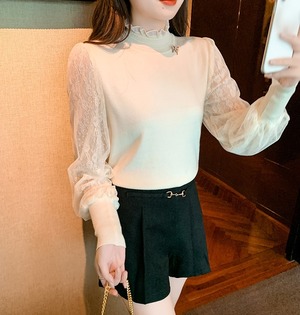 トップス ニットソー セーター プルオーバー 袖あり 長袖 ボリューム袖 パフスリーブ ハイネック スタンドカラー ストレート Iライン 切り替えデザイン ドッキング レース フリル クロシェ 透け感 シースルー かわいい きれいめ 上品 おしゃれ お洒落 レトロ 大人可愛い 大人女子 こなれ感 マニッシュ キュート ガーリー エレガント モダン 存在感 抜け感 無地 秋 20代 30代 デート お出かけ モテ S M L XL 2XL 白 ホワイト