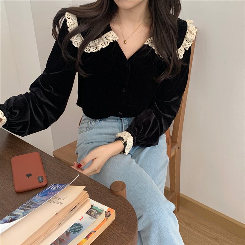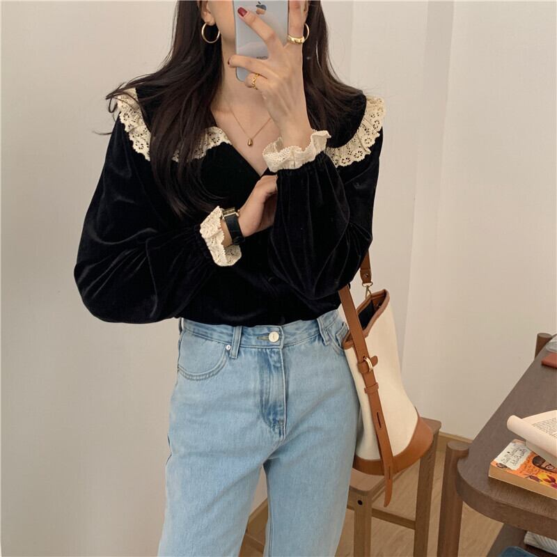 トップス ブラウス 袖あり 長袖 ボリューム袖 パフスリーブ Vネック 襟あり ストレート ワイド Iライン レース フリル スウェード ベロア シック かわいい きれいめ カジュアル 大人 上品 おしゃれ お洒落 レトロ 大人可愛い 大人女子 こなれ感 マニッシュ ラブリー キュート ガーリー モード系 エレガント モダン 存在感 フォーマル とろみ感 無地 秋 冬 レディース デート お出かけ 暖かい モテ フリーサイズ ブラック モノトーン