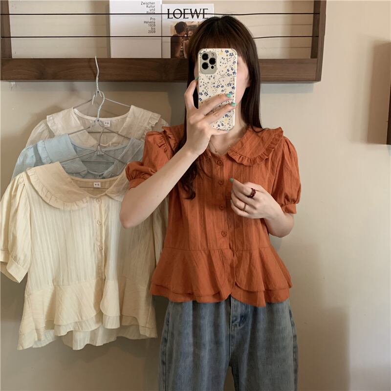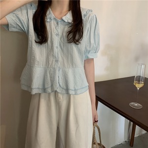 トップス シャツ ブラウス ショート ショート丈 袖あり 半袖 パフスリーブ 襟付き ペプラム シック フレンチシック フリル 切り替えデザイン ドッキング 前開き 透け感 薄手 かわいい きれいめ お洒落 レトロ 大人可愛い 大人女子 こなれ感 ラブリー キュート ガーリー エレガント モダン とろみ感 抜け感 無地 春 10代 20代 30代 レディース デート モテ S M L ホワイト ブルー ブラウン オフホワイト