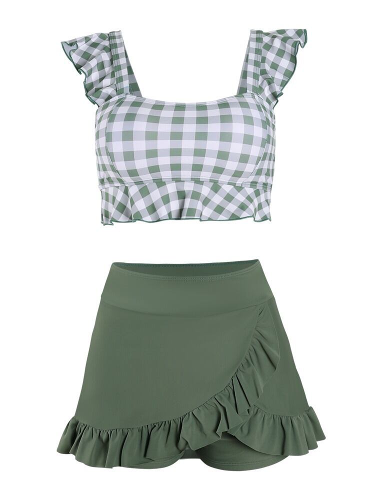 水着 スイムウェア 2点セット 2ピース 上下セット ビキニ ギンガムチェック チェック チェック柄 フリル スカート スクエアネック グリーン ブラック 緑 黒 M L XL 海 海水浴 ビーチ リゾート バカンス プール ナイトプール 温泉 サウナ 海デート デート ガーリー キュート 大人かわいい 大人可愛い 大人 フェミニン シック 10代 20代 30代 スプリット ツーピース 韓国 韓国ファッション 韓国コーデ 韓国スタイル 甘め かわいい 可愛い 体型カバー 美脚 脚長 スタイルアップ