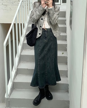 スタイルアップ効果のあるシルエットがポイントのデニムスカート