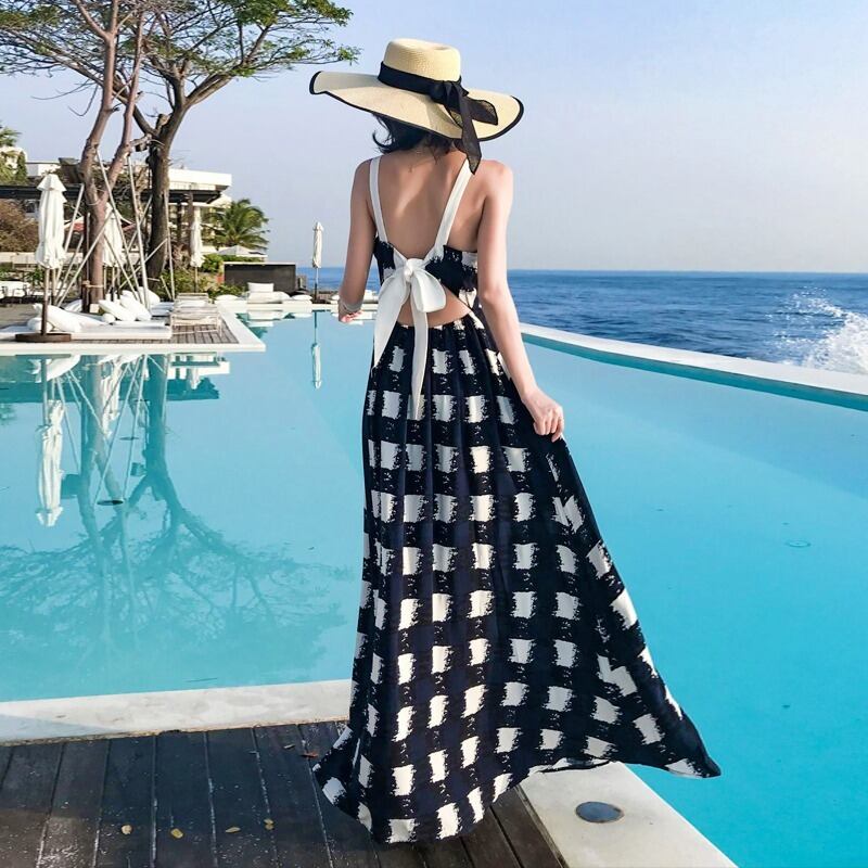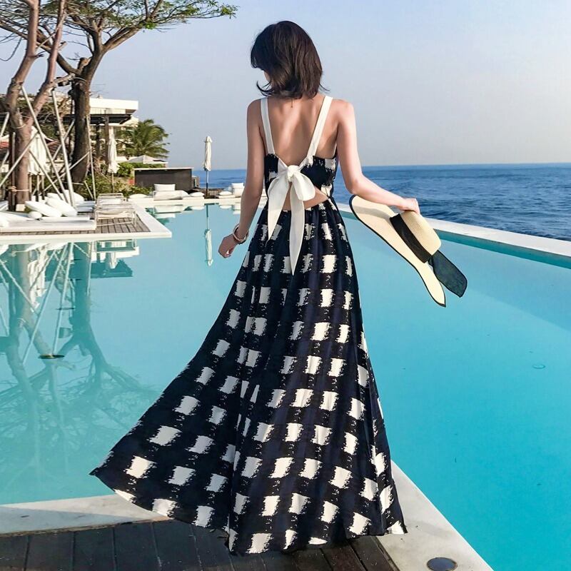 ワンピース ロングワンピース ロング丈 マキシ丈 マキシ丈ワンピース マキシワンピ チェック柄 チェック ギンガムチェック 総柄 総プリント Vネック ノースリーブ バックリボン リボン 背中あき バックシャン Aライン ハイウエスト ネイビー 紺 S M L XL お出かけ デート ビーチ リゾート バカンス 夏 海 おしゃれ かわいい 可愛い 20代 30代 華やか ガーリー キュート 体型カバー 主役級 大胆 レディース 韓国 韓国ファッション 韓国スタイル 韓国コーデ シフォン