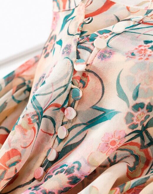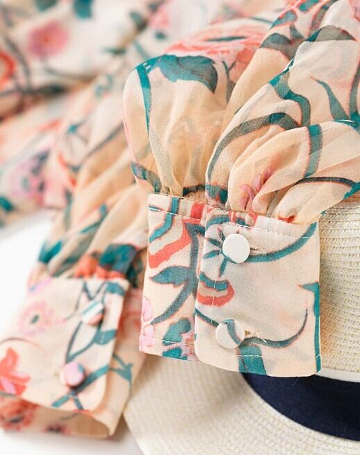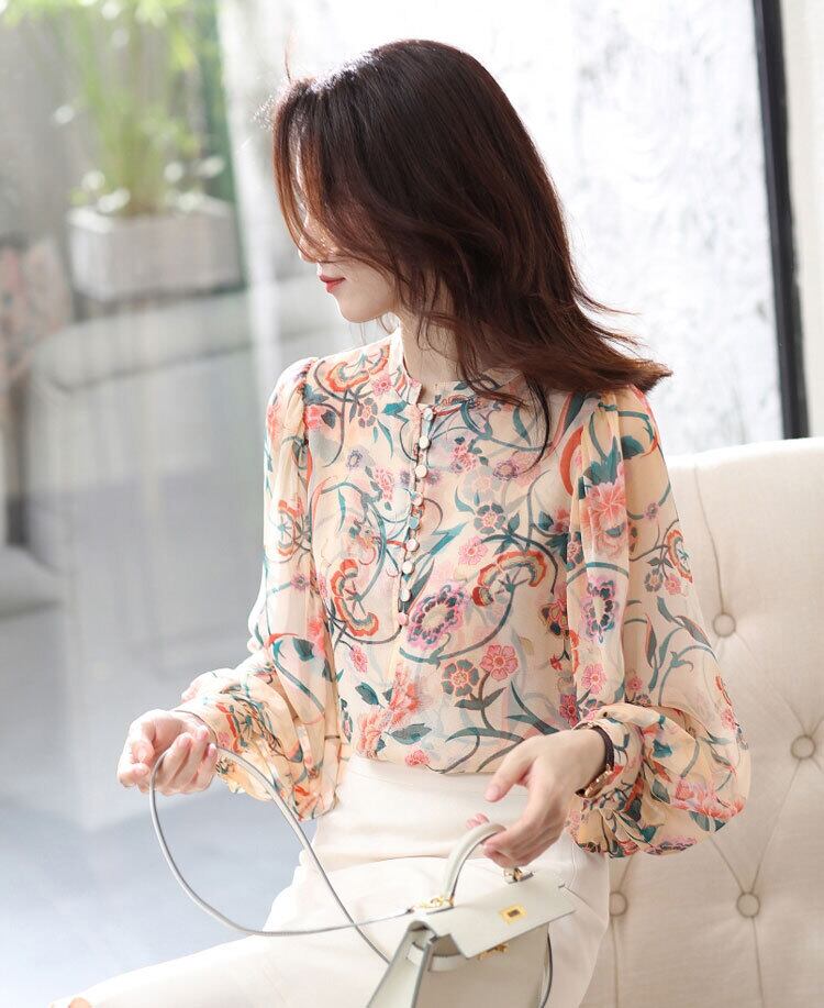 アジアンな花柄が華やかな印象のシフォンブラウス