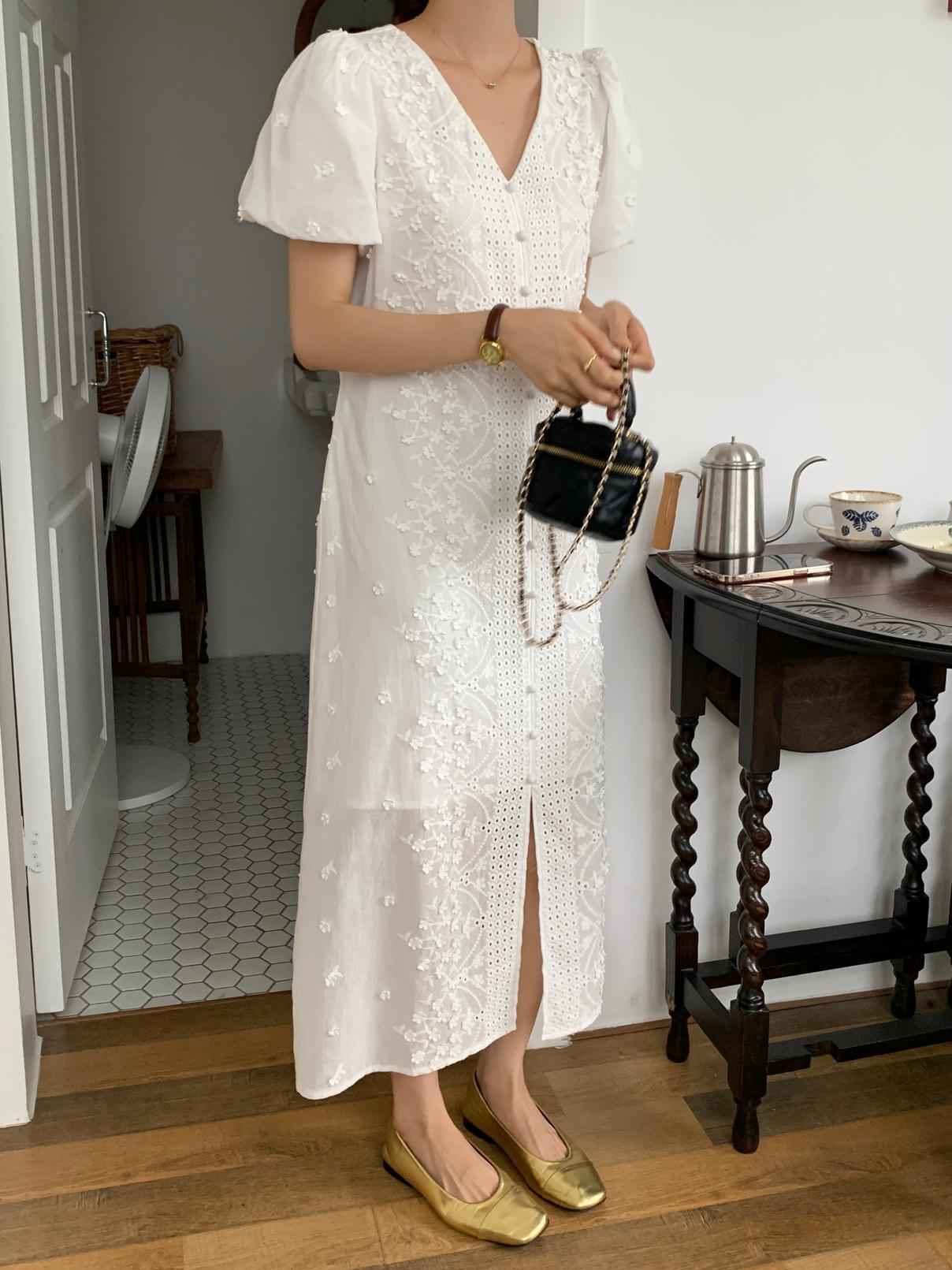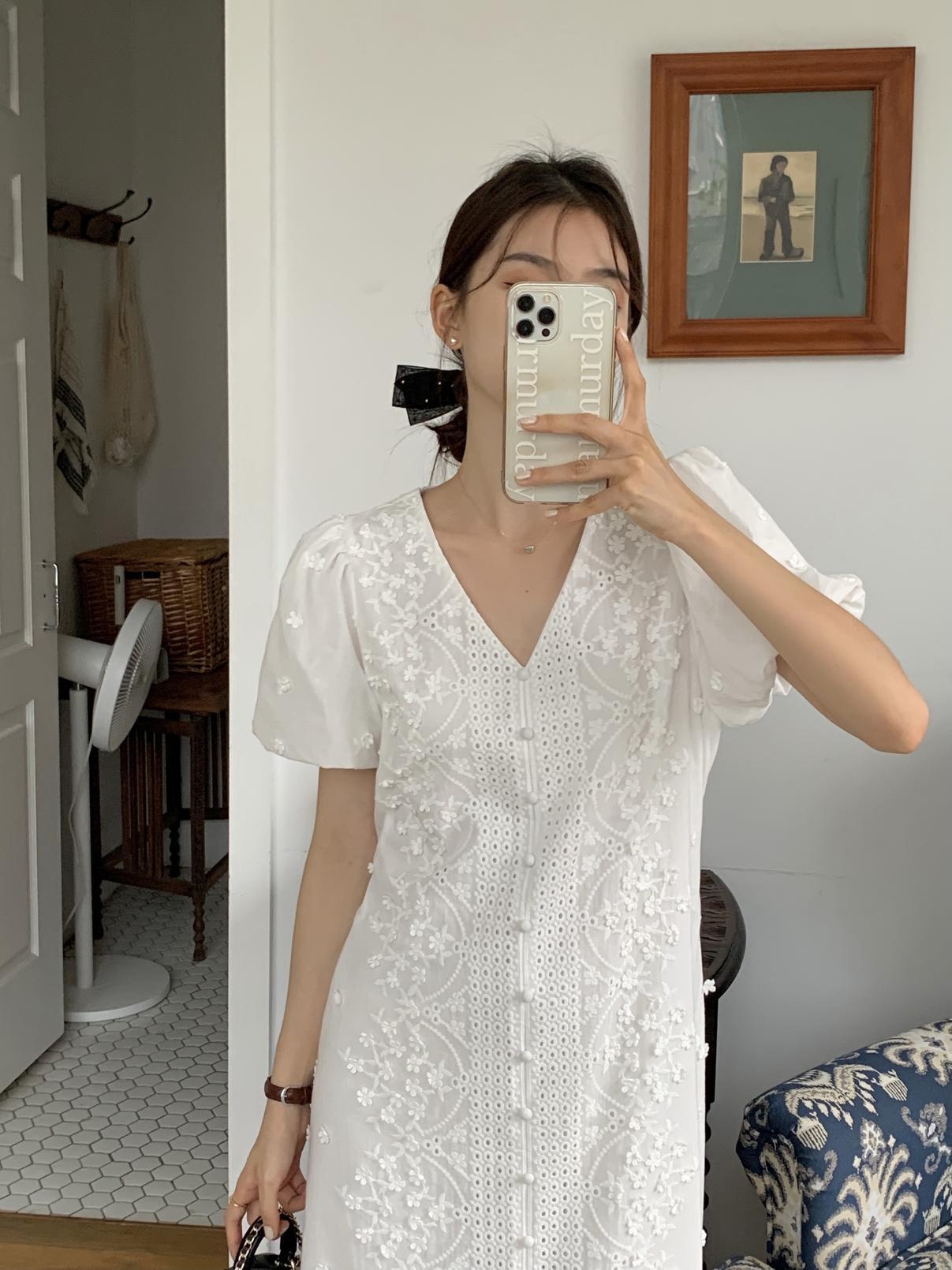 ワンピース 刺繍ワンピース 刺繍 ロングワンピース ロング丈 ロング丈ワンピース マキシ丈 マキシ丈ワンピース 半袖 半袖ワンピース Vネック フロントボタン シアー シースルー 透け感 ホワイト 白 S M フェミニン 20代 30代 春 夏 お出かけ デート 旅行 ランチ ママコーデ 涼し気 きれいめ おしゃれ 甘め かわいい 可愛い 大人かわいい 大人可愛い 清楚 上品 華やか フレンチ フレンチガーリー パフスリーブ ハイウエスト 細身え スタイルアップ 美スタイル レディース 韓国 韓国スタイル