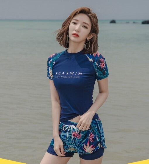 水着 スイムウェア 2ピース 上下セット トロピカル柄 トロピカル 半袖水着 半袖 ショートパンツ スポーティー ネイビー ブルー ピンク 紺 青 桃 M L XL 2XL 3XL 大きいサイズ プラスサイズ 10代 20代 30代 40代 海 海水浴 ビーチ リゾート バカンス プール ナイトプール 温泉 サウナ 海デート デート 夏 スプリット 体型カバー ラウンドネック 水泳 大人 カジュアル レディース 韓国 韓国ファッション 韓国スタイル 韓国コーデ パッド付き パッド入り ロゴ メッシュ