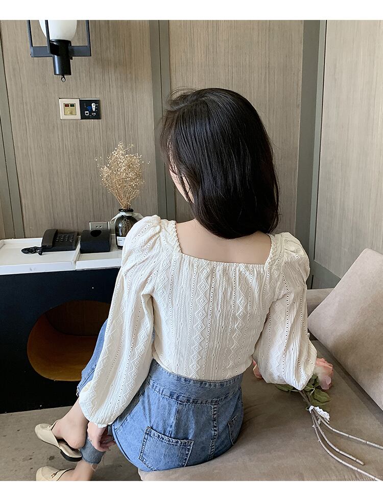 トップス シャツ ブラウス 白シャツ 袖あり 長袖 ボリューム袖 パフスリーブ スクエアネック 襟なし スリム タイト 細身 切り替えデザイン 刺繍 クロシェ ハート ボタン かわいい きれいめ カジュアル 大人 上品 おしゃれ お洒落 レトロ 大人可愛い 大人女子 こなれ感 マニッシュ ラブリー キュート モダン 主役級 存在感 抜け感 20代 30代 40代 レディース デート モテ S M L XL ホワイト