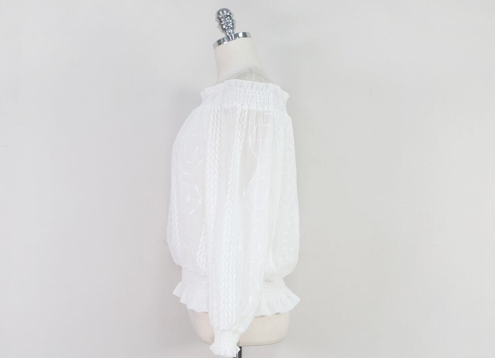 トップス シャツ ブラウス 白シャツ 白トップス 袖あり 長袖 ボリューム袖 オフショルダー フレア ワイド レース 刺繍 シフォン フリル ウエストマーク 透け感 シースルー 薄手 きれいめ カジュアル おしゃれ お洒落 大人可愛い 大人女子 こなれ感 ラブリー ガーリー セクシー エレガント とろみ感 抜け感 柄 春 20代 30代 40代 レディース デート モテ S M L XL ゆったり ゆる 白 ホワイト