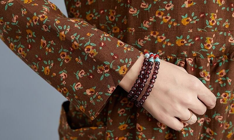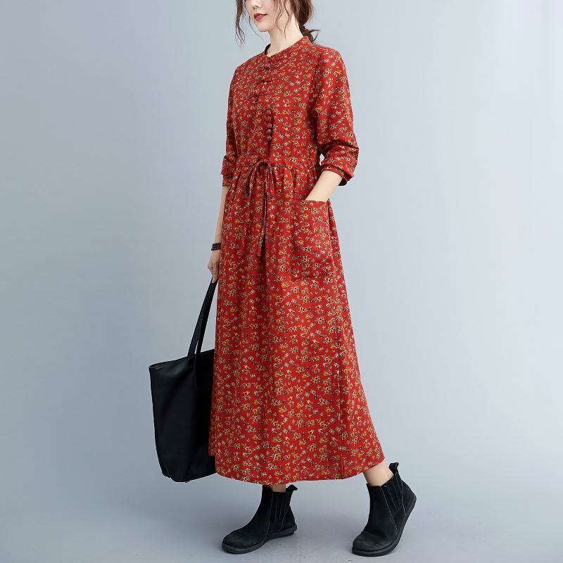 ワンピース ワンピースドレス ワンピドレス ロング ロング丈 袖あり 7分袖 七分袖 スタンドカラー Aライン フレア ウエストマーク ウエストリボン ボタン きれいめ シンプル カジュアル 大人 おしゃれ レトロ アジアン 大人可愛い 大人女子 こなれ感 ガーリー 個性的 エレガント 抜け感 チャイナ チャイナ風 エスニック 柄 花柄 小花柄 フラワー ボタニカル 20代 30代 40代 レディース デート お出かけ M L XL 2XL 3XL レッド ブラウン イエロー 水色 ネイビー