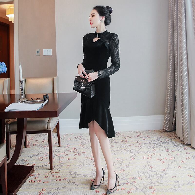 ドレス 衣装 パーティードレス 膝丈ドレス 発表会ドレス ステージドレス 舞台ドレス 膝丈 ひざ丈 膝上 袖あり 長袖 マーメイド マーメイドライン スレンダー スレンダーライン タイト スリム アシンメトリー ケープ ケープ風 ドッキング 透け感 ベルベット 主役級 存在感 ゴージャス おしゃれ クール モード系 セクシー スタイリッシュ モダン かっこいい チャイナ チャイナ風 無地 30代 40代 50代 レディース イベント 秋 冬 S M L XL ブラック