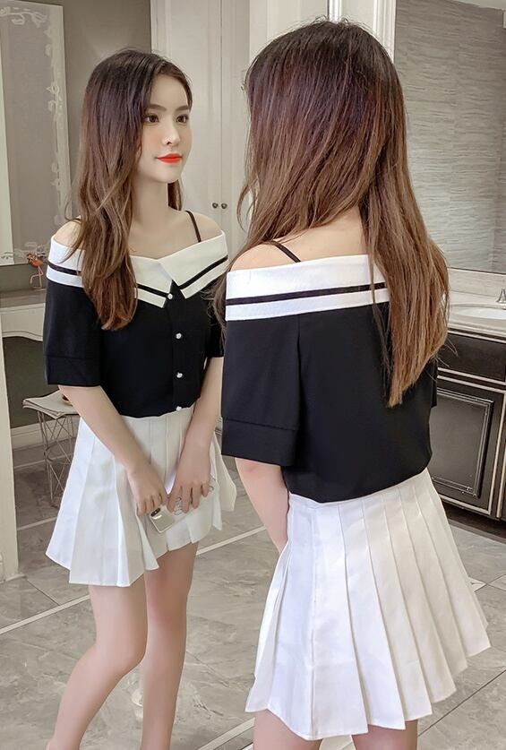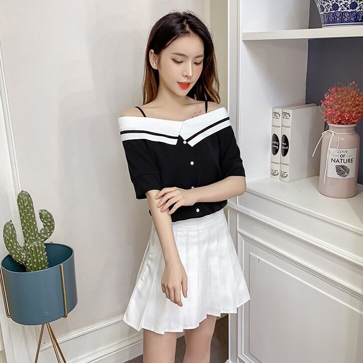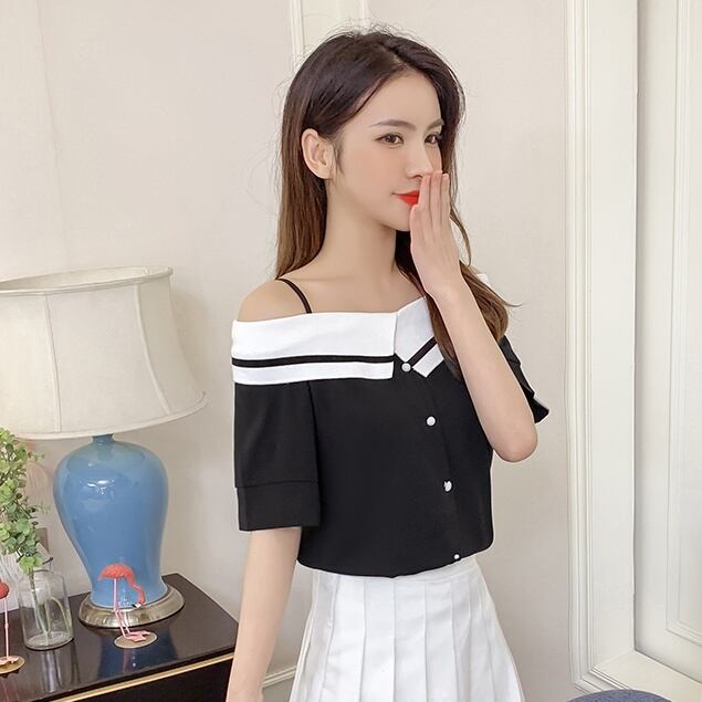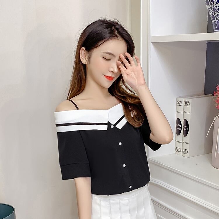 トップス シャツ ブラウス 袖あり 5分袖 五分袖 オフショルダー 襟付き セーラー ストレート ワイド 前開き 薄手 かわいい シンプル カジュアル おしゃれ お洒落 レトロ 大人可愛い こなれ感 マニッシュ キュート ガーリー ルーズ 個性的 クール セクシー とろみ感 抜け感 無地 夏 10代 20代 30代 レディース デート お出かけ 韓国系 オルチャン ファッション スタイル モテ S M L XL 黒 ブラック モノトーン