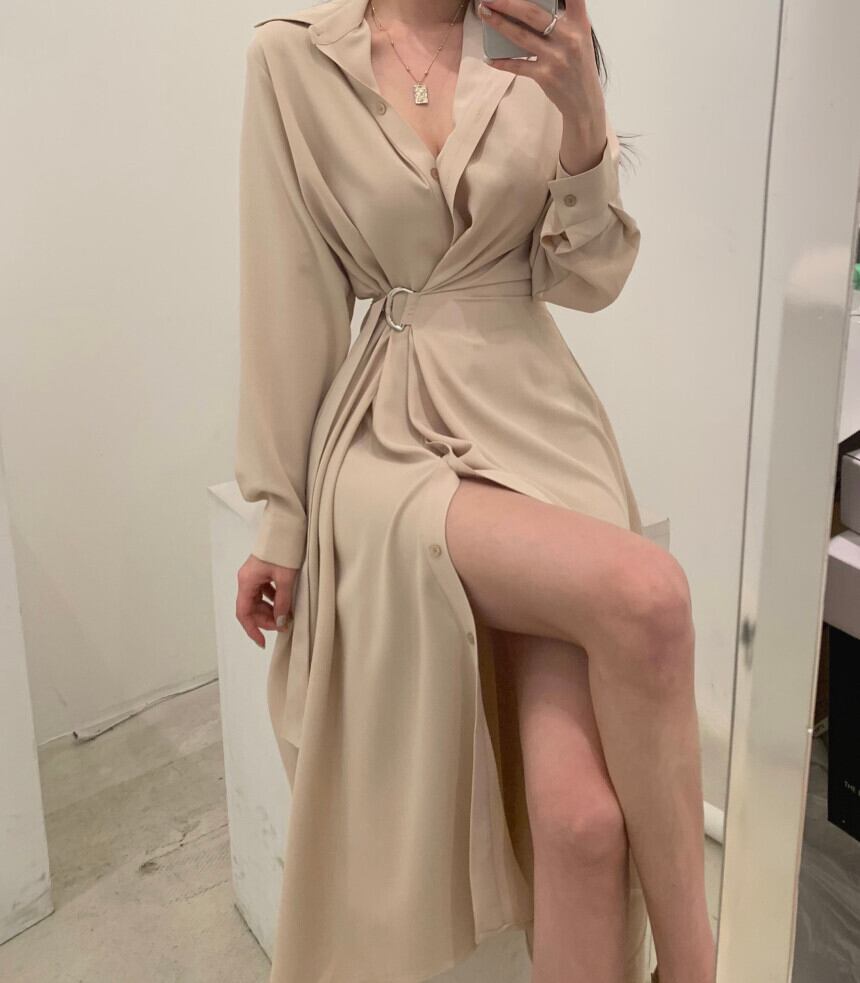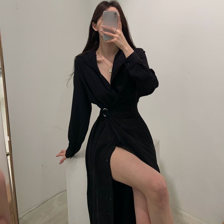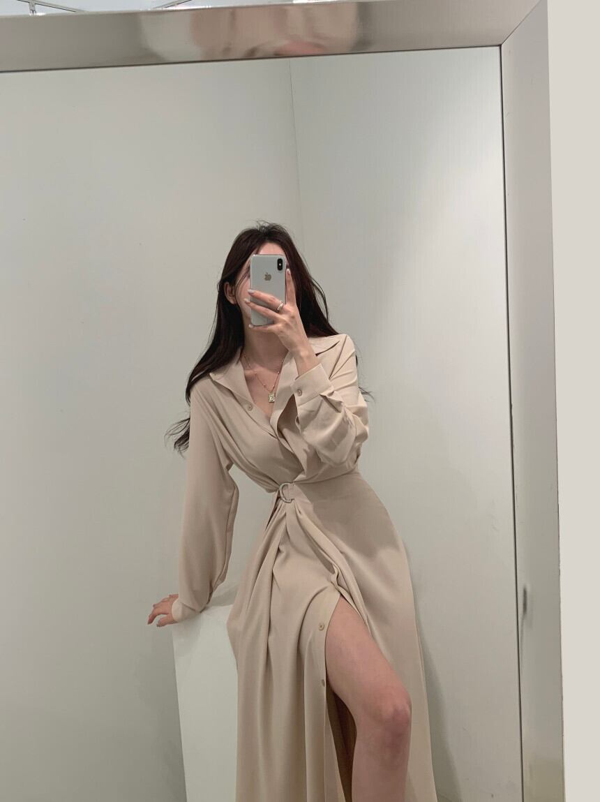 ワンピース シャツ シャツワンピース ワンピドレス ロング ロング丈 袖あり 長袖 ボリューム袖 Vネック 襟付き フレア スリム 細身 ストレート Iライン シフォン ベルト ウエストマーク スリット サイドスリット 薄手 きれいめ シンプル 大人 上品 おしゃれ かっこいい 大人可愛い 大人女子 こなれ感 セクシー エレガント モダン とろみ感 抜け感 無地 春 秋 20代 30代 40代 レディース OL デート モテ 脚長 S M L ブラック オフホワイト ミント くすみカラー 大人カラー