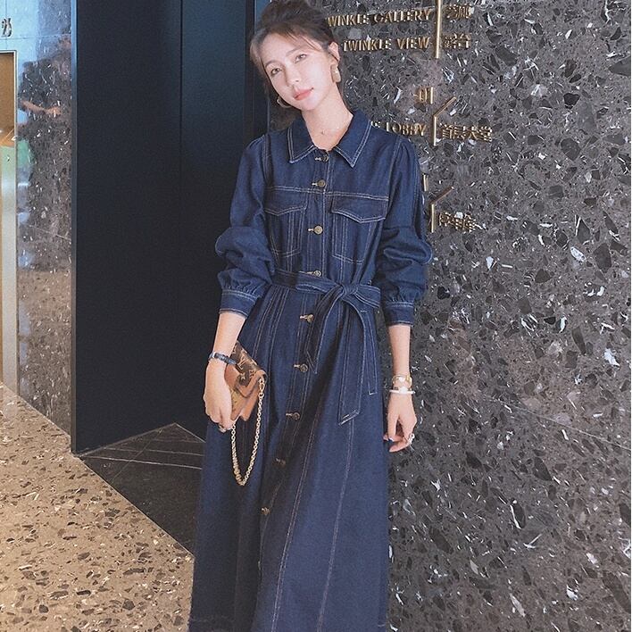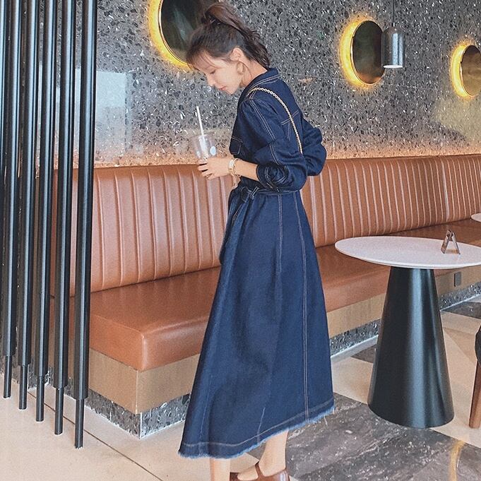 ワンピース シャツワンピース ロング ロング丈 袖あり 長袖 襟付き フレア スリム タイト ストレート Aライン 刺繍 ベルト ウエストマーク 前開き デニム ブルーデニム きれいめ シンプル カジュアル 大人 上品 おしゃれ お洒落 かっこいい レトロ 大人可愛い 大人女子 こなれ感 ラフ マニッシュ ガーリー クール モード系 エレガント モダン 主役級 存在感 無地 春 秋 20代 30代 40代 レディース デート お出かけ モテ S M L XL ネイビー