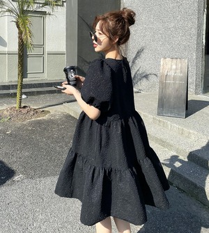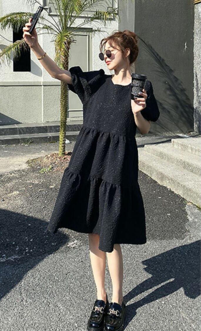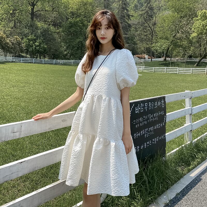 ワンピース 膝丈ドレス ブラックドレス ワンピースドレス ワンピドレス カジュアルドレス 膝丈 ひざ丈 袖あり 半袖 パフスリーブ ラウンドネック 襟なし Aライン 切り替えデザイン フレア レース かわいい 大人可愛い シンプル カジュアル 大人 上品 お洒落 大人女子 こなれ感 キュート ガーリー ルーズ モダン ナチュラル マニッシュ 無地 10代 20代 30代 レディース デート お出かけ モテ 春 夏 S M ホワイト ブラック