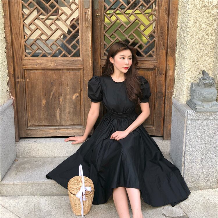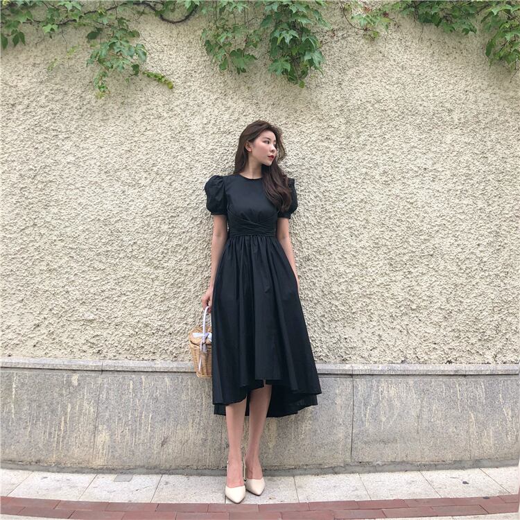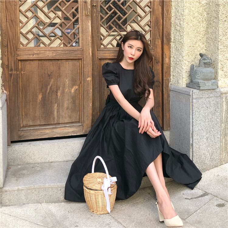 ドレス ワンピース カラードレス 膝丈ドレス ワンピースドレス ワンピドレス カジュアルドレス 膝丈 ひざ丈 膝下 袖あり 半袖 パフスリーブ Uネック 襟なし プリンセス プリンセスライン アシンメトリー フレア ウエストマーク ウエストリボン バックリボン おしゃれ 大人可愛い 大人女子 こなれ感 ラブリー キュート ガーリー エレガント モダン 存在感 華やか 王道 無地 30代 レディース デート パーティー イベント モテ 春 夏 S M L ホワイト ブラック イエロー