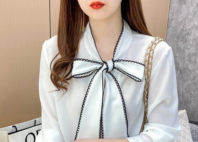 トップス ブラウス 白トップス 袖あり 長袖 スタンドカラー リボンタイ ストレート ワイド レース シフォン リボン 薄手 きれいめ 大人 上品 おしゃれ お洒落 かっこいい 大人可愛い 大人女子 こなれ感 マニッシュ ガーリー ルーズ クール モード系 エレガント モダン フォーマル とろみ感 抜け感 無地 オールシーズン 20代 30代 40代 レディース OL 通勤 デート お出かけ 着回し 重ね着 モテ 3XL 4XL 5XL 6XL 7XL 8XL 9XL 大きいサイズ ホワイト ブラック
