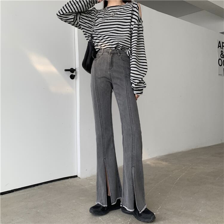 ボトムス パンツ Gパン ズボン ロング ロング丈 フレアレッグ ストレート ワイドレッグ スリットレッグ ハイウエスト デニム シンプル カジュアル おしゃれ お洒落 かっこいい 大人女子 こなれ感 ラフ ルーズ クール 無地 オールシーズン シーズンレス 10代 20代 30代 40代 レディース お出かけ 休日 普段使い 楽ちん 美脚 脚長 S M L XL 2XL 3XL 4XL 灰色 グレー くすみカラー