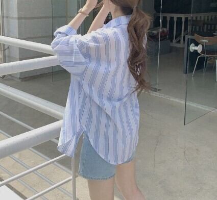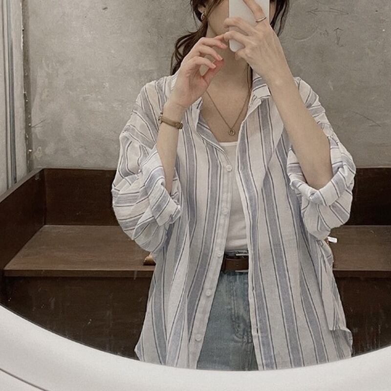 トップス シャツ ボタンシャツ ボタンダウン 長袖シャツ 長袖 ロングスリーブ ストライプ ストライプ柄 縞模様 フロントボタン ブルー グレー 青 灰 S M L XL カジュアル 大人カジュアル 大人 20代 30代 お出かけ デート デイリー デイリーユース 普段使い 羽織り 爽やか さわやか シンプル 定番 おしゃれ こなれ感 きれいめ きれい色 ラフ ルーズ ゆったり ゆる 楽ちん ママコーデ ランチ 公園 お散歩 春 夏 日除け レディース 韓国 韓国ファッション 韓国スタイル 韓国コーデ