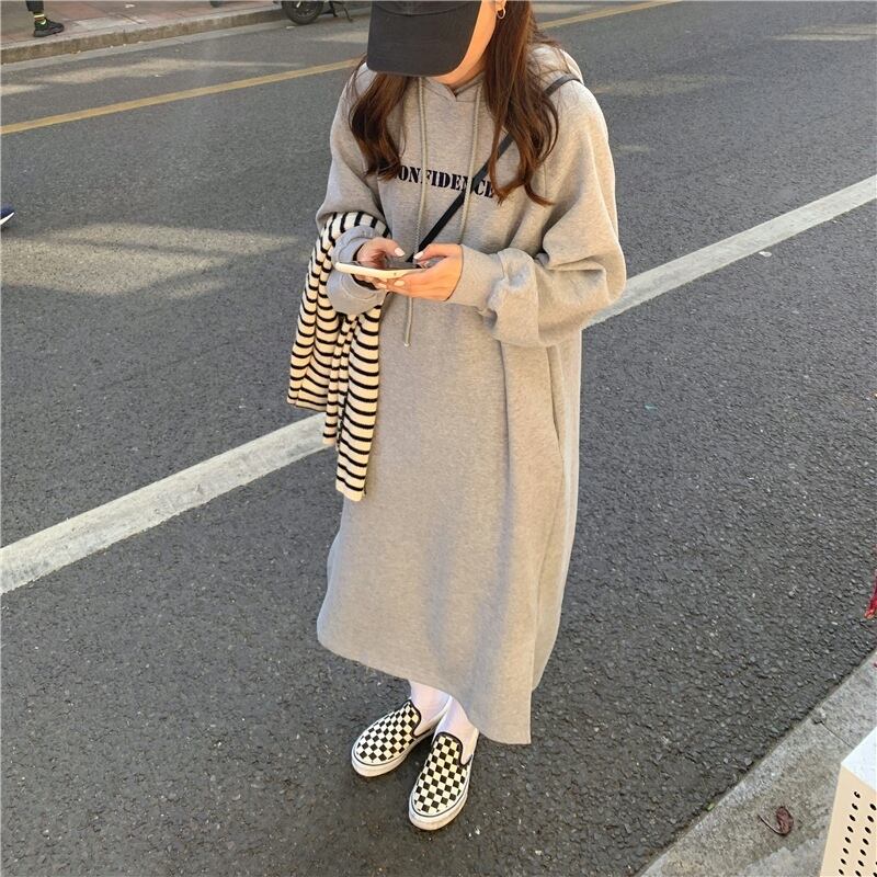 ワンピース パーカー フーディー ミディアム丈 袖あり 長袖 スリム ストレート Iライン スリット サイドスリット フード付き 伸縮性 厚手 かわいい シンプル カジュアル おしゃれ お洒落 かっこいい 大人可愛い 大人女子 こなれ感 ラフ ボーイッシュ ガーリー ルーズ 抜け感 無地 秋 冬 10代 20代 30代 レディース 休日 旅行 普段使い 楽ちん 暖かい モテ M L XL ブラック グレー ベージュ