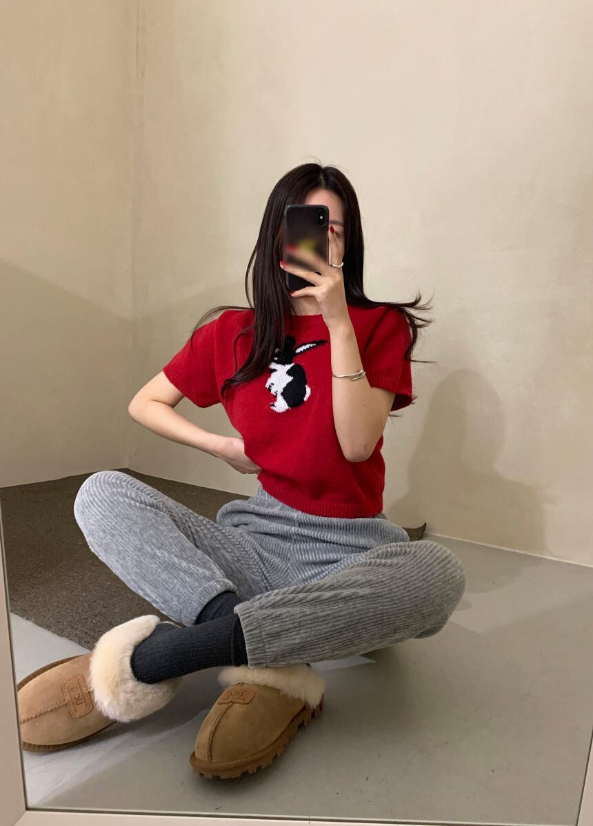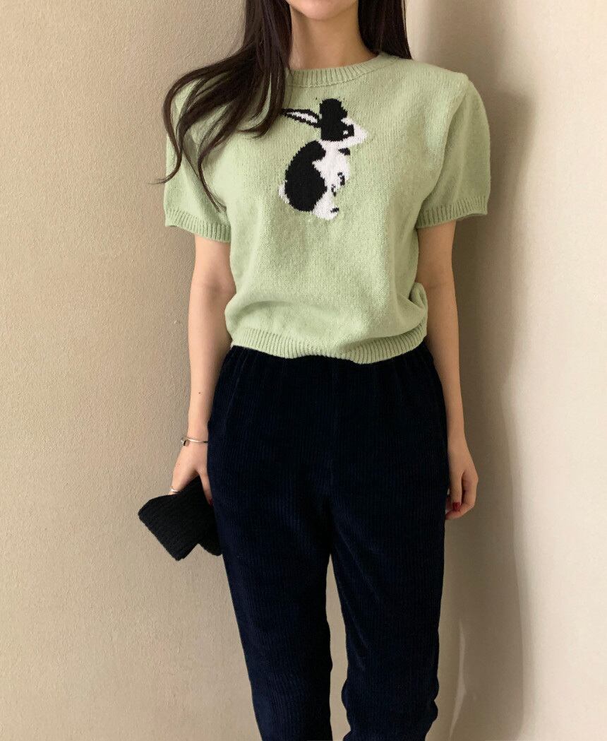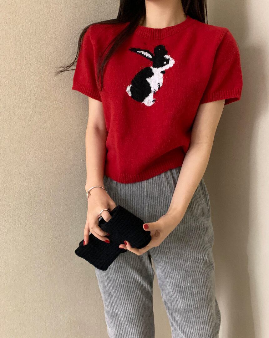 トップス ニットソー セーター プルオーバー ショート ショート丈 袖あり 半袖 Uネック スリム 編み込み ニット かわいい 大人可愛い シンプル カジュアル 大人 お洒落 レトロ 大人女子 こなれ感 マニッシュ キュート 個性的 柄 アニマル柄 ウサギ うさぎ 春 20代 30代 レディース お出かけ 休日 普段使い S M L XL 2XL レッド ミント