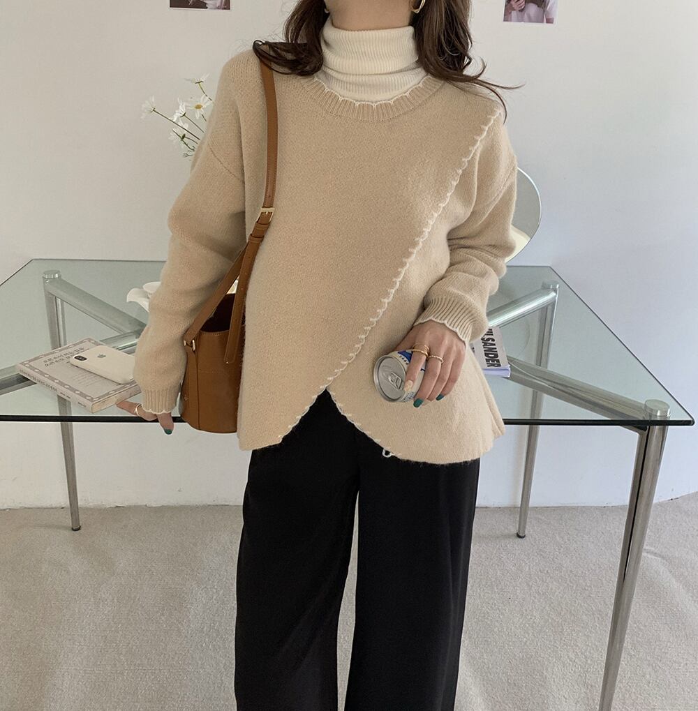 トップス ニット ニットセーター セーター プルオーバー 長袖ニット 長袖セーター 長袖 ロングスリーブ Uネック ラウンドネック バイカラー アシンメトリー サイドスリット スリット シンプル 無地 ベージュ オフホワイト 白 ワンサイズ カジュアル 大人カジュアル 大人 お出かけ デート デイリー 普段使い 着回し 秋 冬 ナチュラル 素朴 ママコーデ 公園 お散歩 ランチ フレンチ ゆったり ゆる 楽ちん ドロップショルダー 縁取り レディース おしゃれ きれいめ 体型カバー 韓国 韓国ファッション