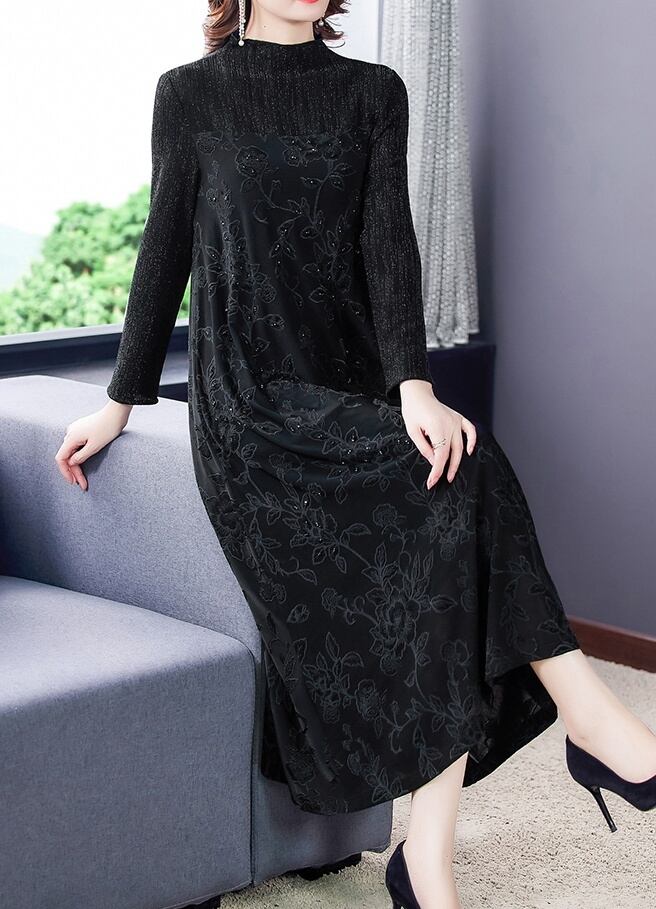 ドレス ワンピース パーティードレス ロングドレス Aラインドレス ブラックドレス ワンピースドレス ワンピドレス ロング ロング丈 袖あり 長袖 襟なし スタンドカラー Aライン タイト スリム シャーリング エレガント きれいめ シンプル 華やか 大人 上品 おしゃれ お洒落 レトロ クラシック クール モード系 セクシー スタイリッシュ モダン 柄 フラワー 40代 50代 60代 レディース パーティー イベント ホテル レストラン 秋 冬 S M L XL 2XL 3XL ブラック