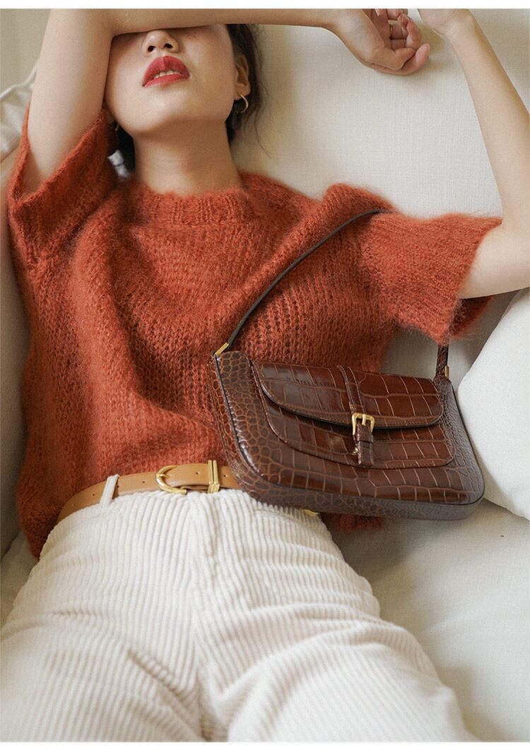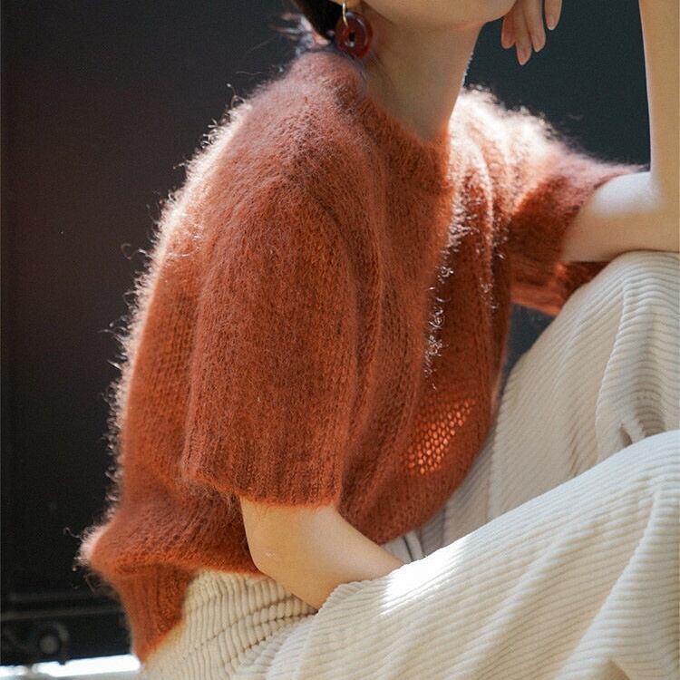 トップス ニットソー ショート ショート丈 袖あり 半袖 Uネック ストレート Iライン もこもこ モコモコ ふわふわ 編み込み 透け感 シースルー ニット 薄手 きれいめ シンプル カジュアル 大人 上品 おしゃれ お洒落 大人可愛い 大人女子 こなれ感 ラフ キュート ガーリー ルーズ エレガント モダン とろみ感 抜け感 無地 春 秋 20代 30代 40代 レディース デート お出かけ モテ S M L ゆったり ブラウン ピンク