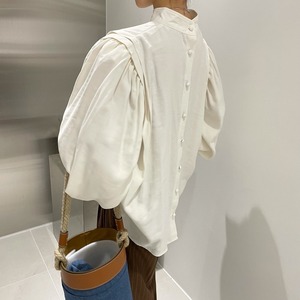 トップス シャツ ハイネック バックボタン ランタンスリーブ シンプル 春 秋 メンズライク おしゃれ かわいい ホワイト ブラック カーキ ゆったり 体型カバー 大人スタイル 個性的 大人可愛い ボーイッシュ カジュアル 人気 長袖 オフスタイル