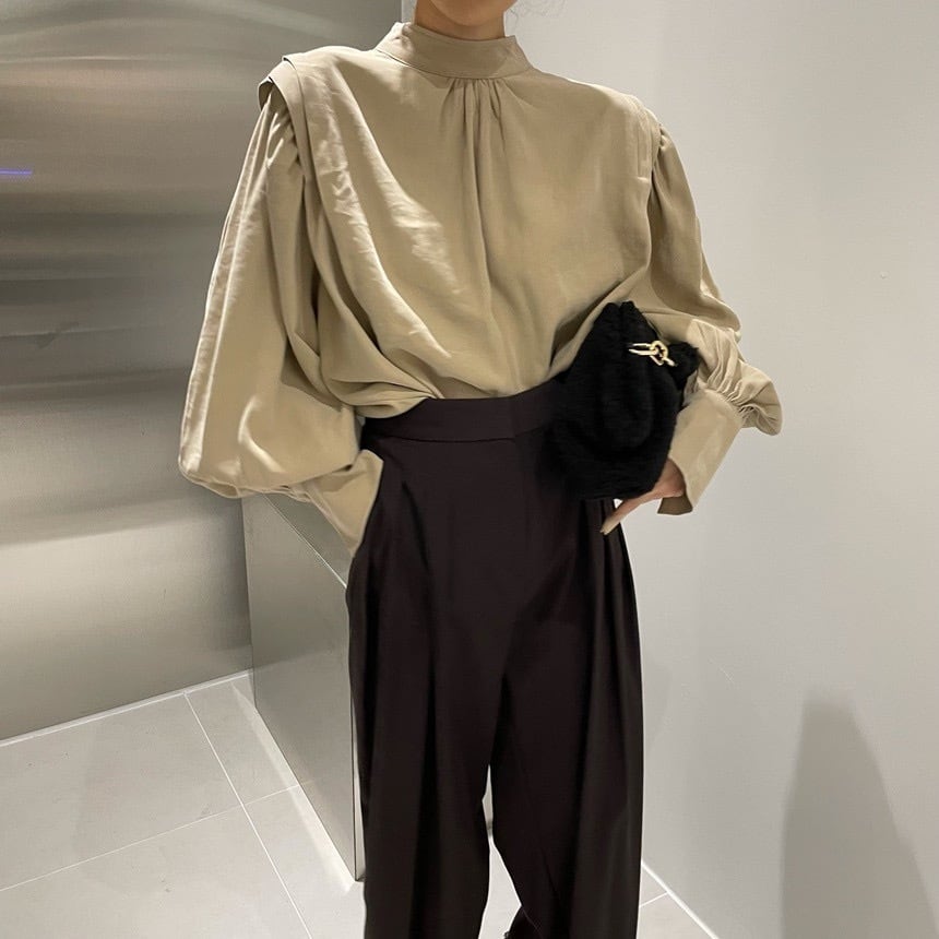 ハイネックがかわいい、ランタンスリーブが魅力のシャツ。