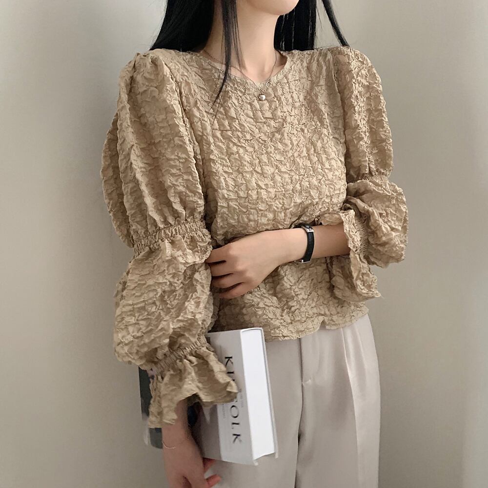 トップス シフォンシャツ ランタンスリーブ ラウンドネック シンプル カジュアル シック 上品 エレガント 個性的 大人可愛い 春 ふんわり 体型カバー ゆったり おしゃれ かわいい フェアリー 長袖 ジッパー 人気 10代 20代 30代
