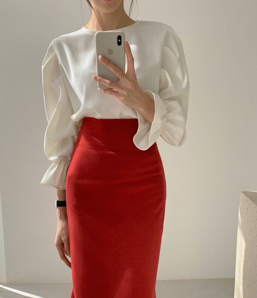 トップス ブラウス ラウンドネック バルーン袖 トランペット 春 秋 シンプル 無地 エレガント 上品 個性的 大人可愛い カジュアル お嬢様 オフィスカジュアル OL 長袖 ホワイト ブラック カーキ 人気デザイン
