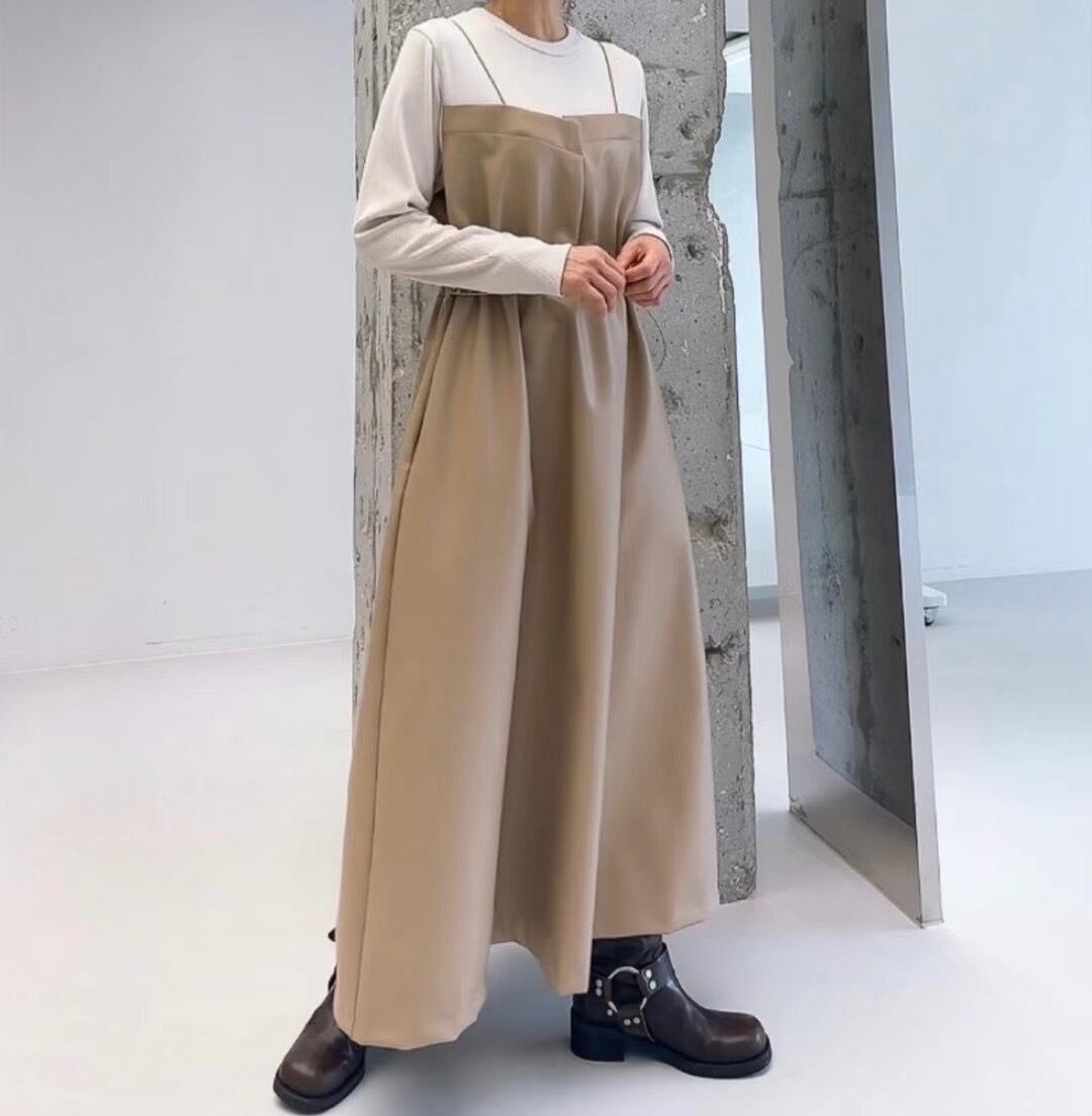 ワンピース ドッキング セットアップ風 シンプル カジュアル レザー ボーイッシュ かっこいい クール 長袖 無地 ビスチェ風 大人可愛い 個性的 春 秋 おしゃれ ミモレ丈 体型カバー 楽ちん ゆったり 大人っぽい