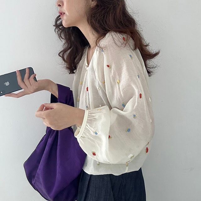 トップス ブラウス パフスリーブ ルーズシャツ 刺繍 長袖 カジュアル シンプル 個性的 大人可愛い 春 ホワイト ゆったり ふんわり かわいい おしゃれ 人気 定番 普段使い 10代 20代 30代