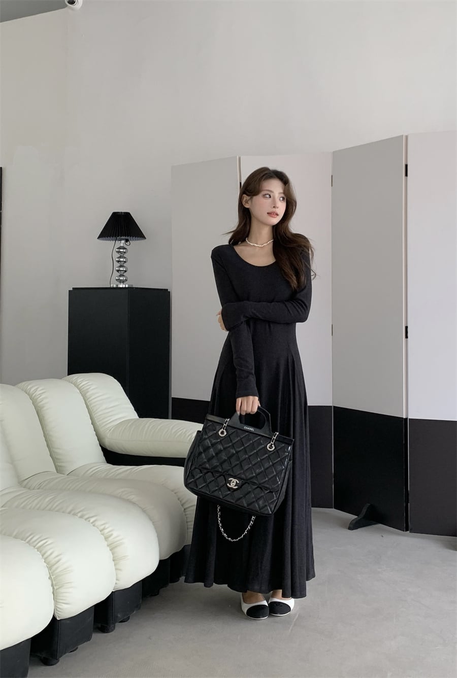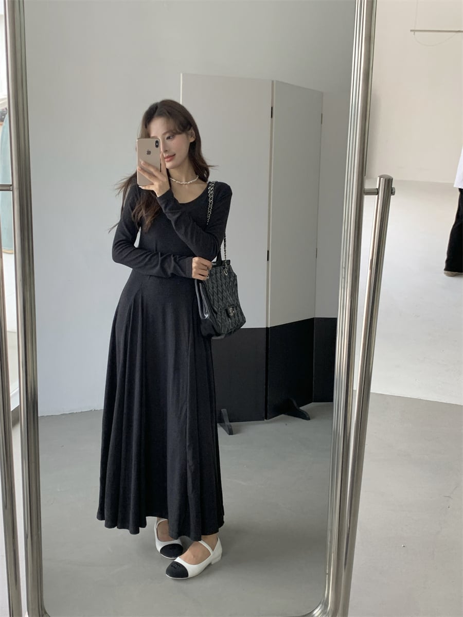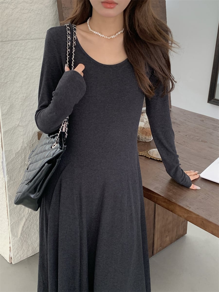 ワンピース ハイウエスト 長袖 Aライン ロング丈 ロングワンピ 長袖 無地 シンプル カジュアル ダークグレー 春 秋 大人可愛い 着やせ 細見え おしゃれ かわいい 脚長効果 10代 20代 30代
