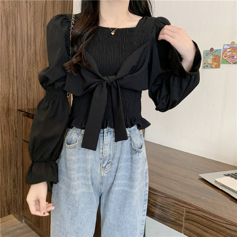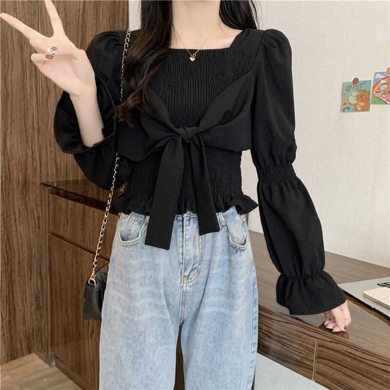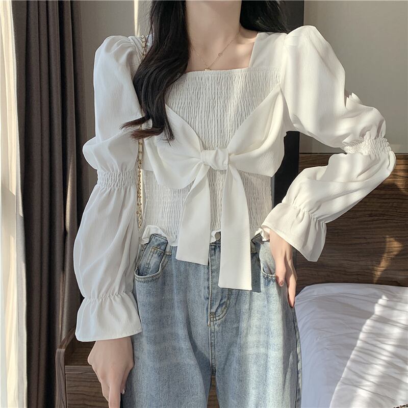 トップス ブラウス ビッグリボン パフスリーブ ショート丈 長袖 無地 シンプル カジュアル フレンチ スイート おしゃれ 大人可愛い かわいい エレガント 上品 春 秋 着やせ ホワイト ブラック 10代 20代