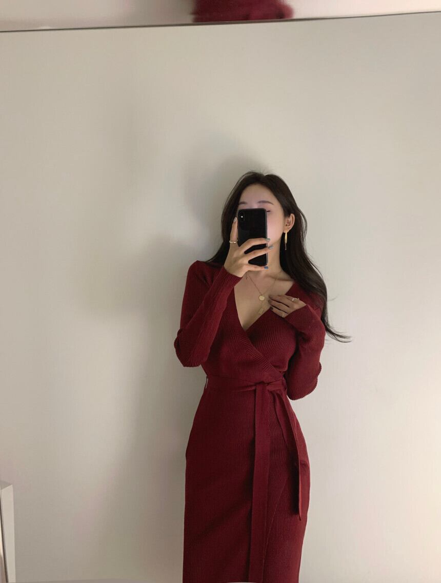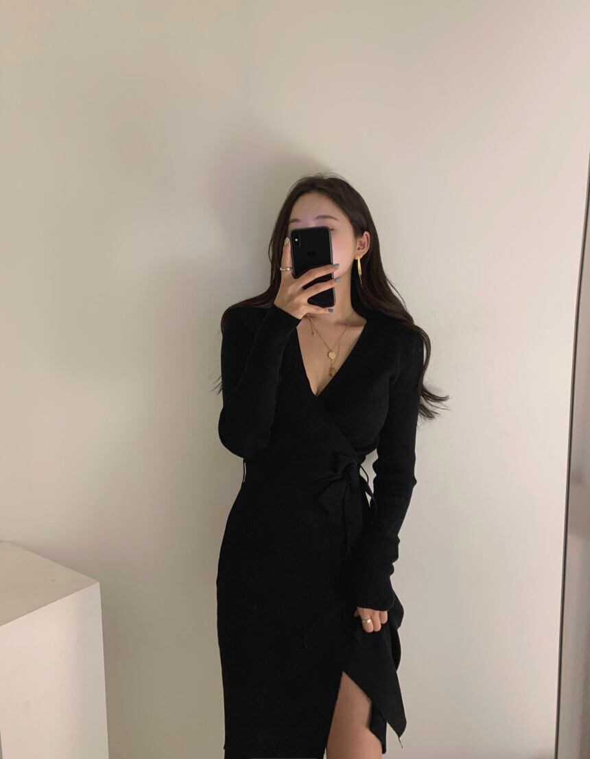 ワンピース Vネック スリット ウエストマーク ニット ミニ丈 ショート丈 大人可愛い エレガント 上品 長袖 無地 シンプル カジュアル 食事会 パーティー 二次会 春 秋 カーキ レッド ブラック 10代 20代 30代