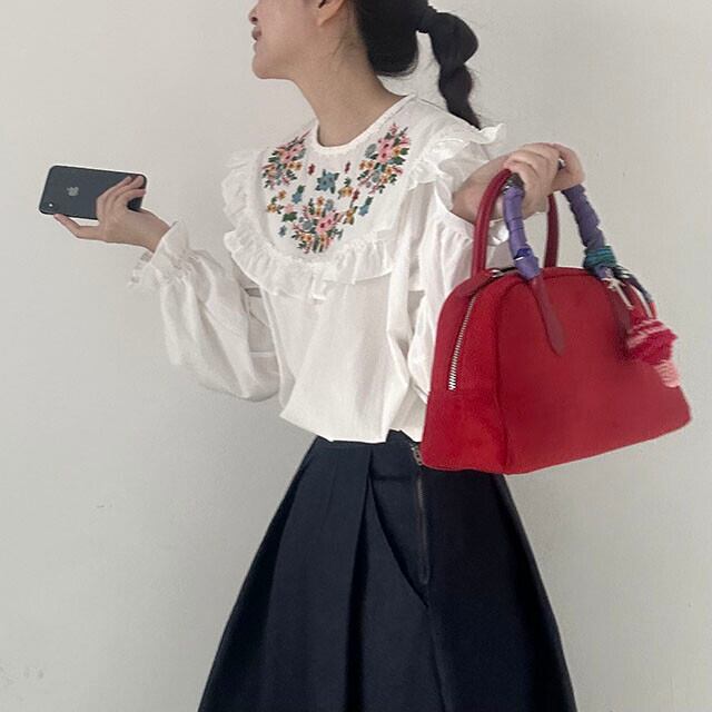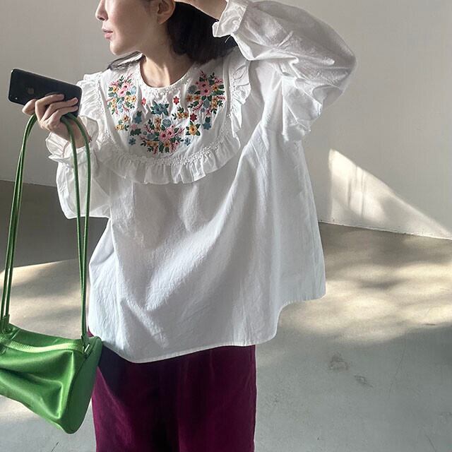 トップス ブラウス ビックカラー 刺繍 花 フラワー 長袖 春 秋 レース パフスリーブ シンプル カジュアル 大人可愛い 個性的 レトロ 人気 普段使い ホワイト ワンサイズ 10代 20代 30代