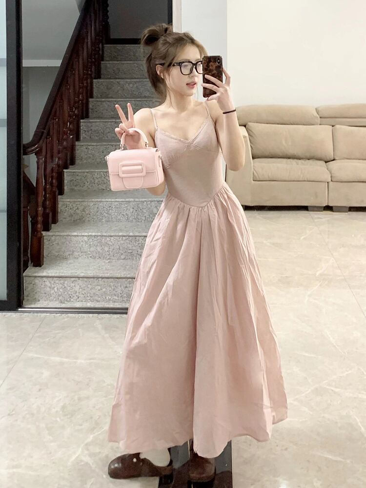 ワンピース サスペンダードレス キャミワンピ フレア Aライン 春 夏 シンプル カジュアル ロング丈 無地 デート 普段使い お出かけ ライトピンク 大人可愛い おしゃれ かわいい 10代 20代 30代