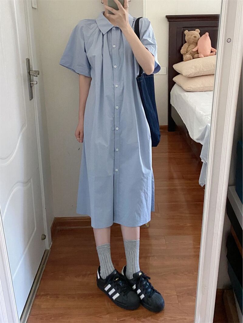 ワンピース ポロカラーシャツドレス シングルブレスト ミッドレングススカート 半袖 春 夏 襟付き シンプル カジュアル 無地 ブルー 定番 普段使い 前ボタン 清楚 おしゃれ 大人可愛い かわいい 10代 20代 30代