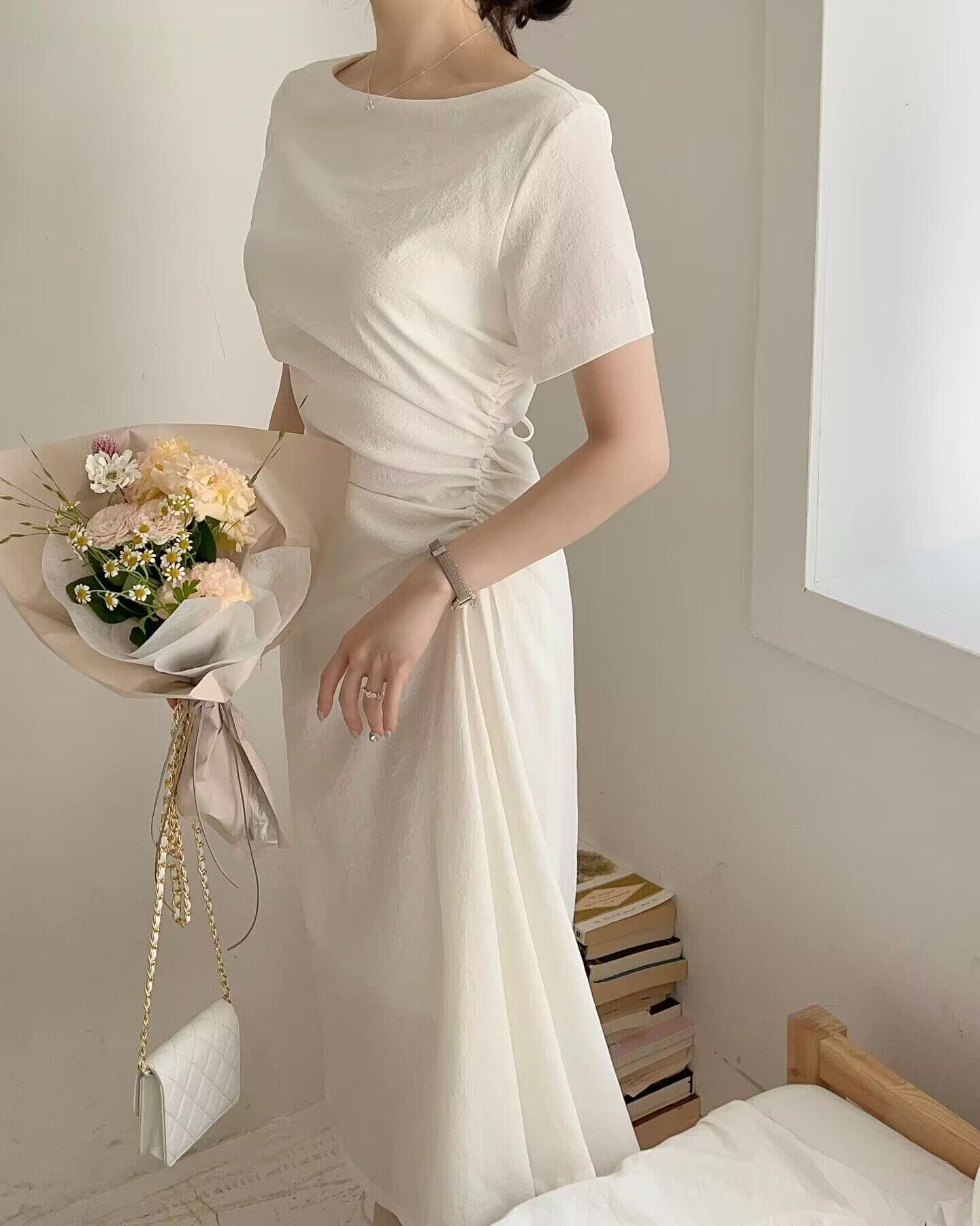 ワンピース ドレス 韓国スタイル シック スリムドレス レディース ミドル丈スカート ホワイト シンプル カジュアル タイト ラウンドネック 半袖 無地 春 夏 大人可愛い おしゃれ ハイウエスト デート 普段使い 20代 30代
