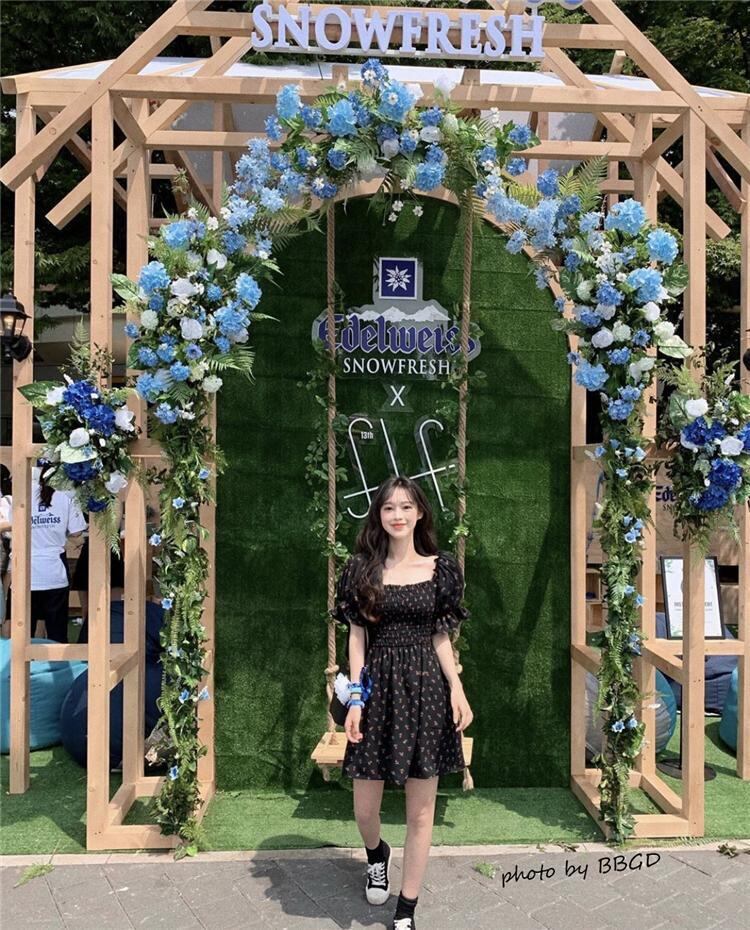 ワンピース パフスリーブ ドレス 半袖 春 夏 花柄 ミニ丈 ショート丈 上品 エレガント シンプル カジュアル 大人可愛い おしゃれ かわいい アプリコット ブラック 普段使い 定番 10代 20代 30代