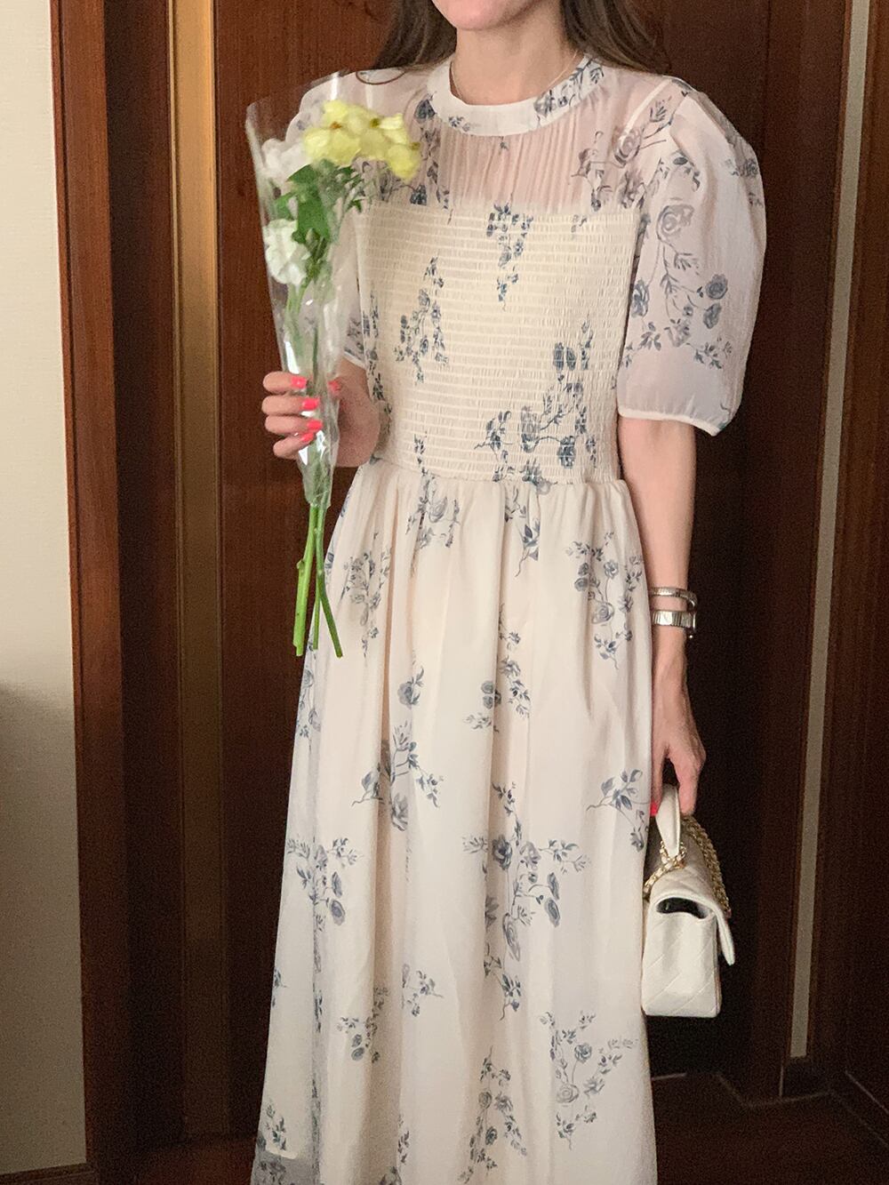 ワンピース パフスリーブ プリーツ ミッドレングススカート 花柄 ふんわり シンプル カジュアル 大人可愛い 春 夏 レトロ おしゃれ かわいい アプリコット 上品 エレガント 普段使い 定番 10代 20代 30代