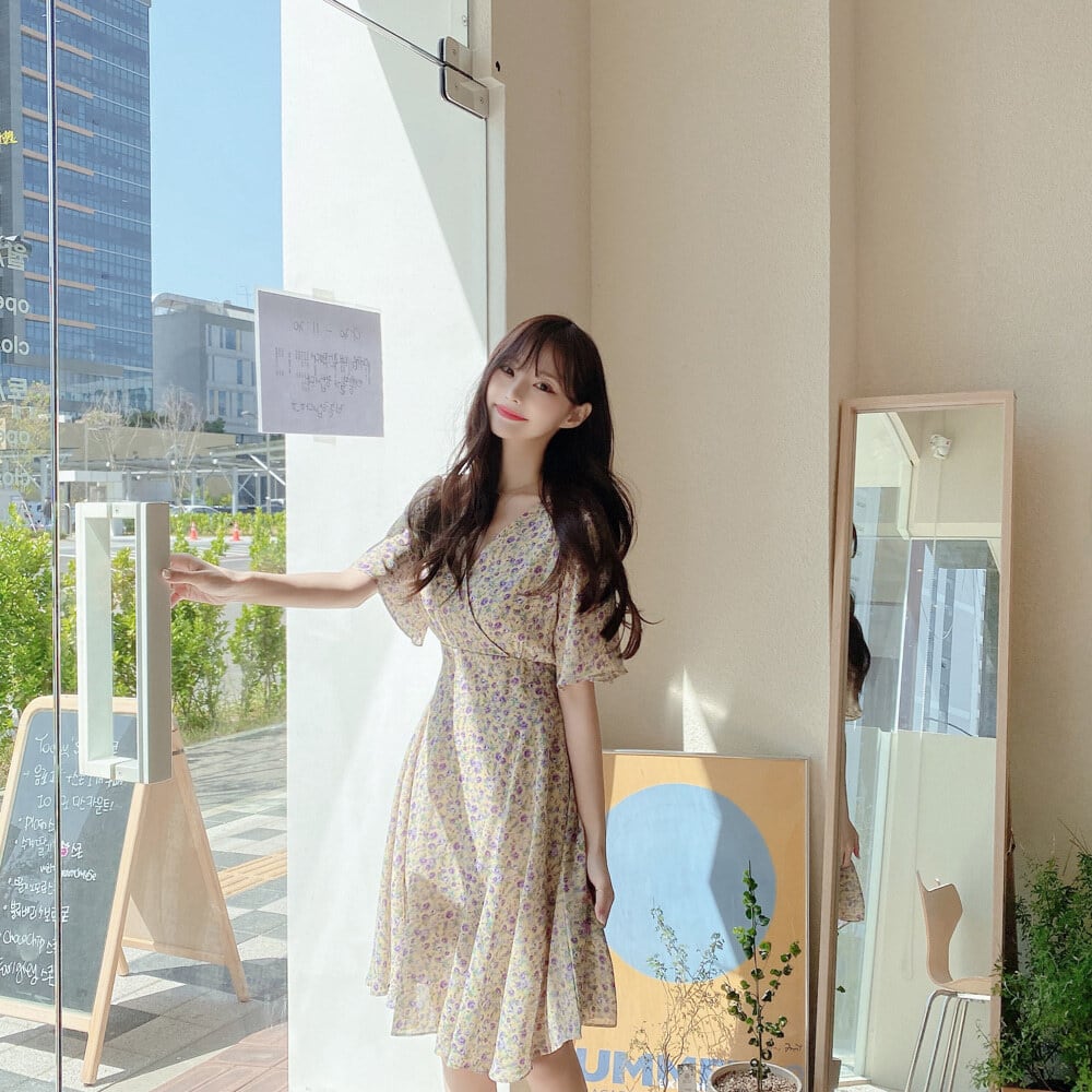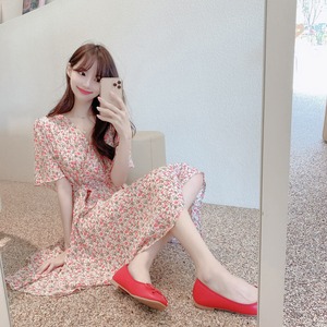 ワンピース 花柄 半袖 Aライン ふんわり バックリボン ウエストマーク ハイウエスト Vネック おしゃれ 大人可愛い かわいい デート 普段使い 春 夏 女の子 着やせ効果 ふんわり シフォン 10代 20代
